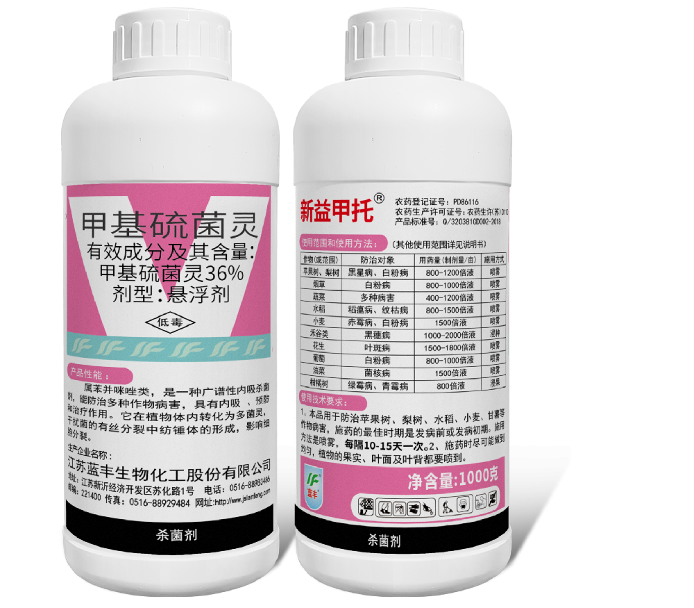 甲托、殺滅爾,廣譜內(nèi)吸性低毒殺菌劑,具有內(nèi)吸、治療和內(nèi)吸作用,被植物吸收后轉(zhuǎn)化為多菌靈,干擾病菌的有絲分裂中紡錘體的形成,影響細(xì)胞分裂。可防治麥類黑穗病、赤霉病,黃瓜白粉病、炭疽病,茄子、蔥頭、芹菜、番茄、菜豆等灰霉病、炭疽病、菌核病,蘋果輪紋病、炭疽病,葡萄褐斑病、炭疽病、灰霉病,桃褐腐病,柑橘貯藏中的青霉、綠霉病,大麗花花腐病、月季褐斑病、海棠灰斑病等。主要用于葉面噴霧。